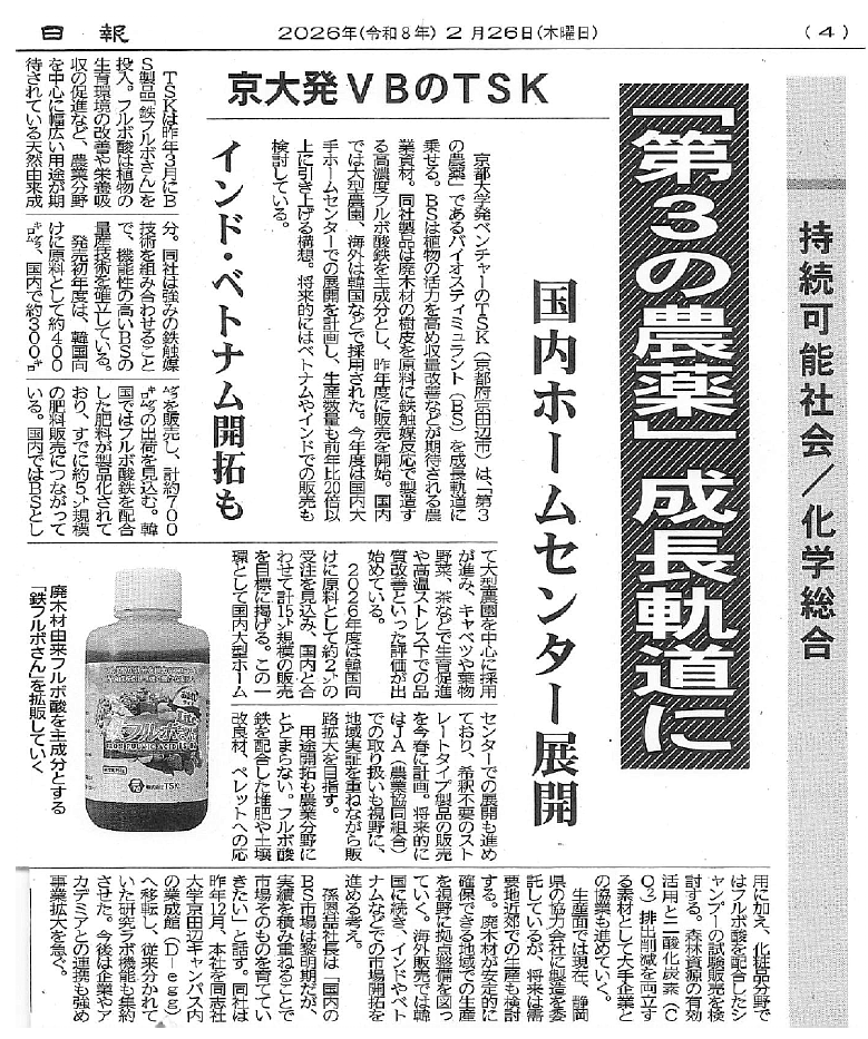 2026年2月26日付の化学工業日報にて当社商品の「鉄フルボさん」が紹介されました。